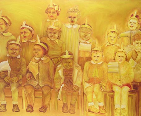 "חדוה בן דוד, ציירת שהיתה בעברה מורה בבית ספר יסודי, עוסקת בטקסיות הבית ספרית של מערכת החינוך הממלכתית, המוכרת לכל ילד עירוני-חילוני בוגר המערכת. “וכולנו אור איתן”, מתוך שיר החנוכה הידוע, מזמן חוויה קולקטיבית מושלמת, בתוכה כל ילד מנפנף בדגלו, נושא את נרו ותורם את חלקו למשימת “באנו חושך לגרש”. יחד - מבטיח השיר - נוכל לעשות זאת.